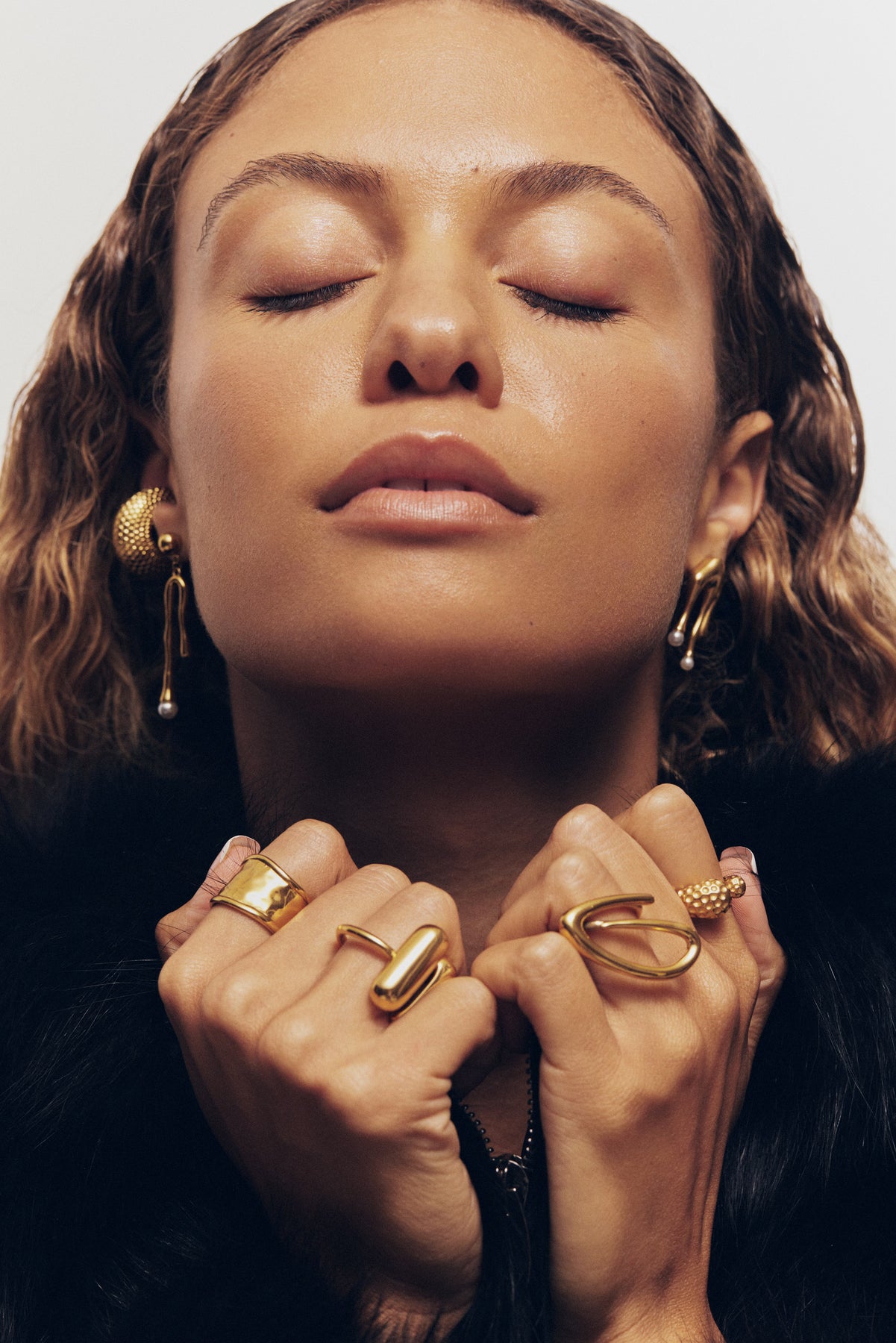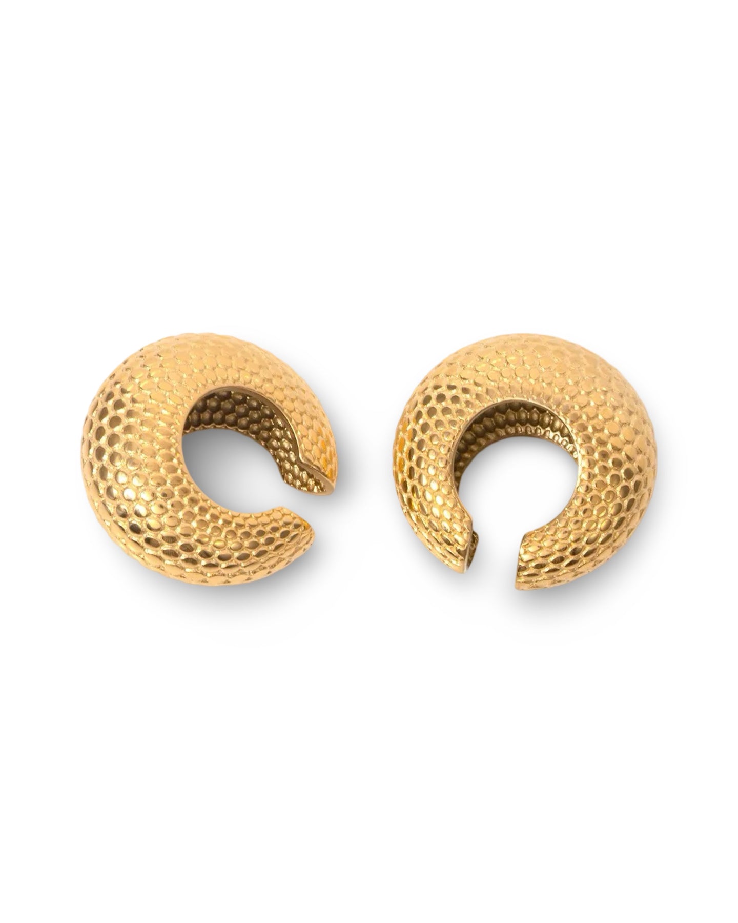 This single ear cuff showcases a rich, tactile texture that gives it depth and dimension. Its bold design wraps around the ear, offering a unique and contemporary statement without the need for a piercing. The cuff’s chunky silhouette and intricate detailing make it a standout accessory, adding a touch of edge and luxury to any look. Perfect for elevating both casual and formal outfits.