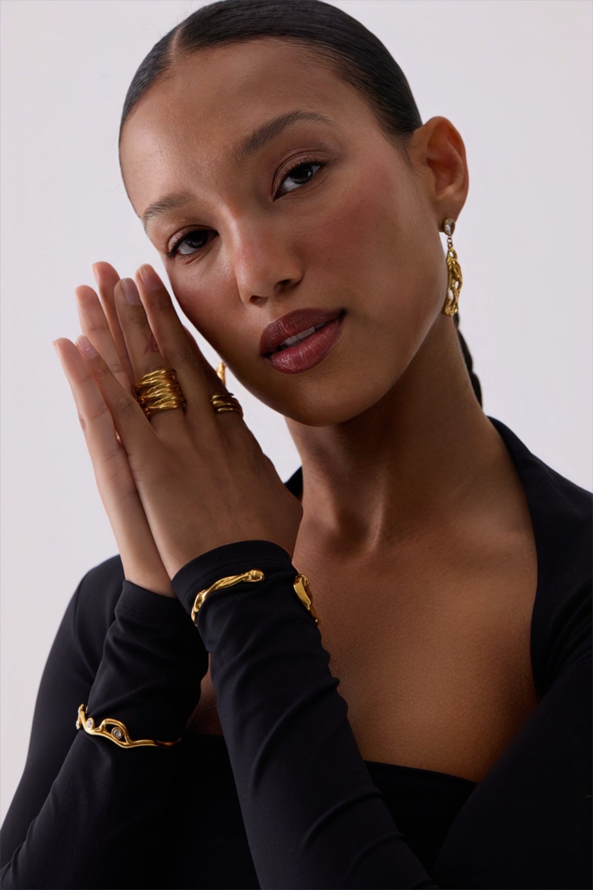 Our pieces are made with titanium steel and coated in PVD gold plating — a long-lasting, tarnish-resistant finish that’s more durable than traditional gold plating. It’s water-resistant, hypoallergenic, and safe for sensitive skin.