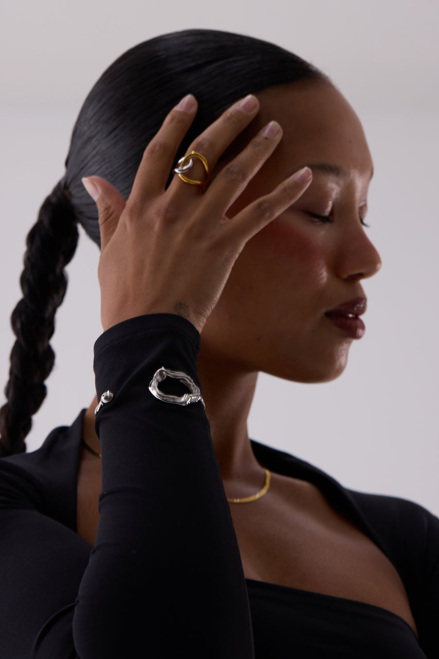 To clean, gently wipe with a soft cloth after wear. Avoid contact with perfumes, lotions, and cleaning products to maintain its shine. Store separately in your inhvn pouch to prevent surface scratches.