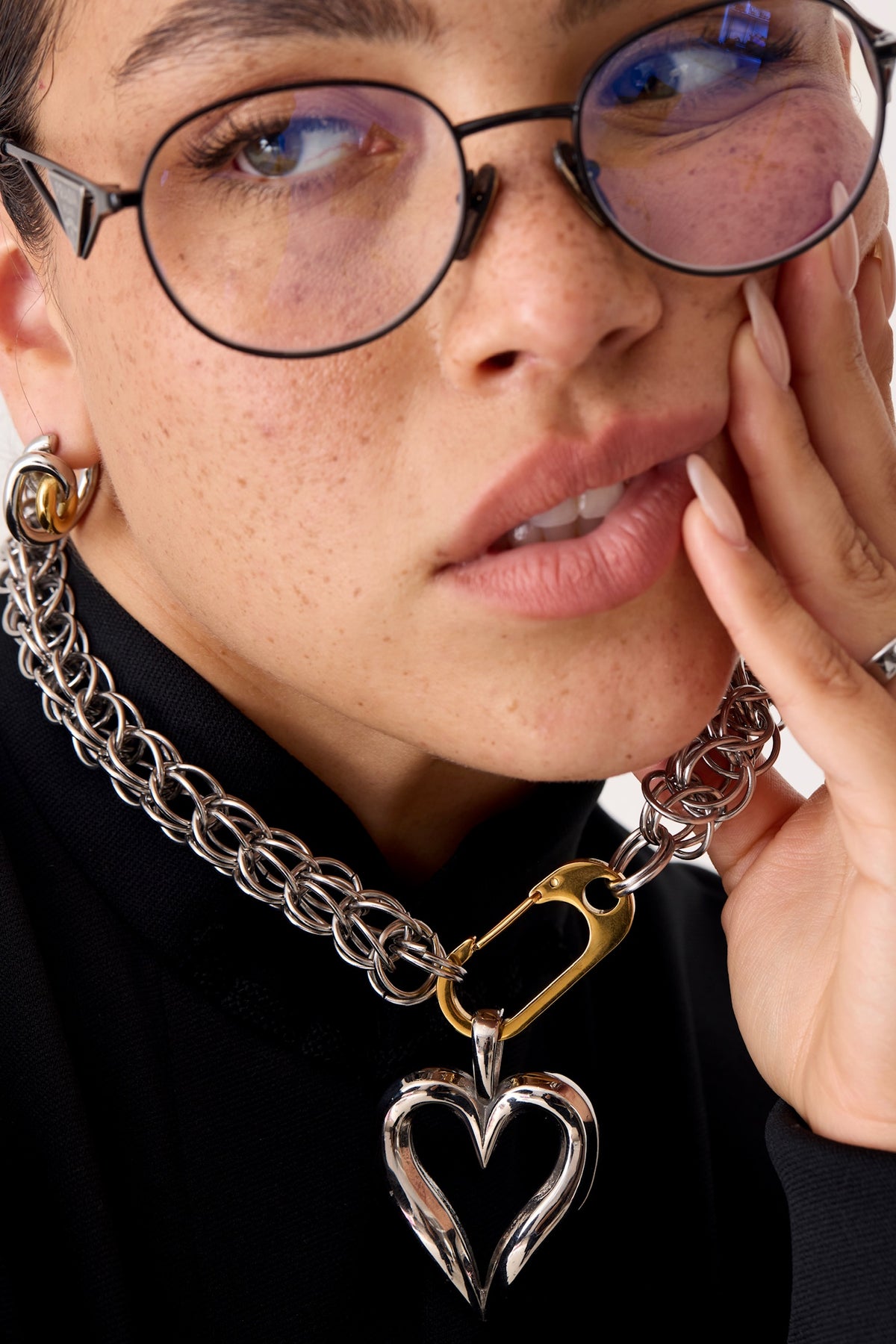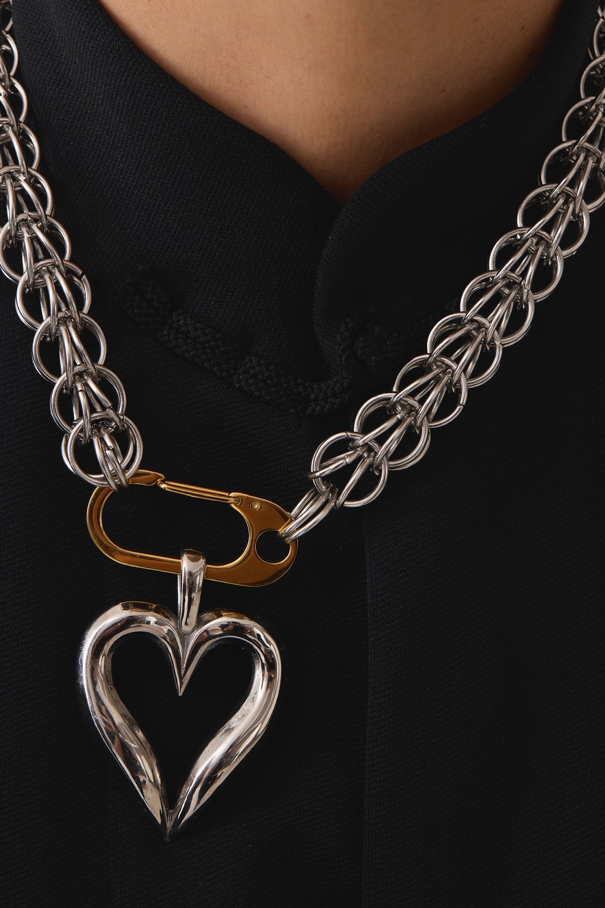 A bold mixed metal necklace featuring an intricate stainless steel weave and a polished gold carabiner clasp. Industrial, sculptural, and made to stand out.
