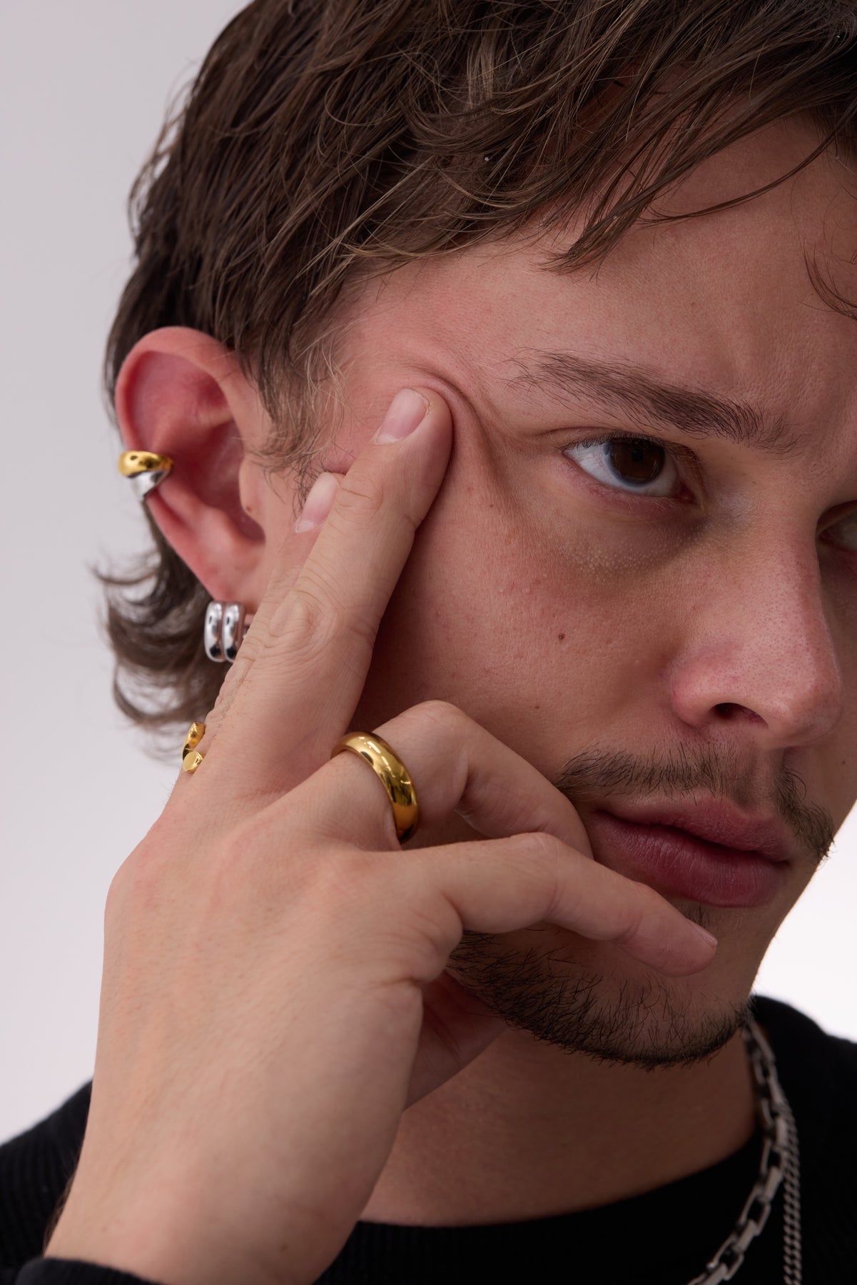 A polished silver rests against a warm gold base, stacked in a soft, curved form that feels intentional yet effortless. The silhouette is compact but dimensional, designed to hug the ear comfortably while catching light from every angle.