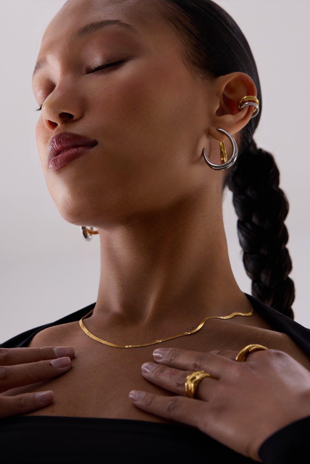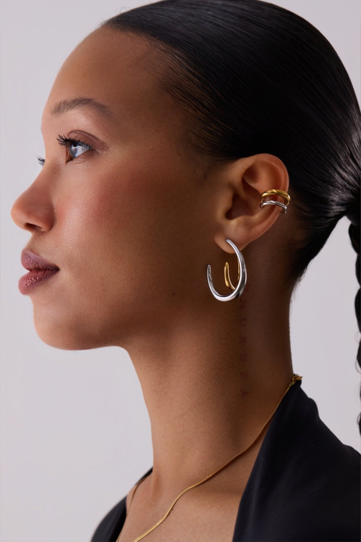 A sculptural ear cuff defined by contrast and curvature. Two polished bands—one gold, one silver—wrap the ear in a soft, open form that feels intentional and understated. The layered design creates dimension without bulk, offering a balanced mix of warmth and cool tone.