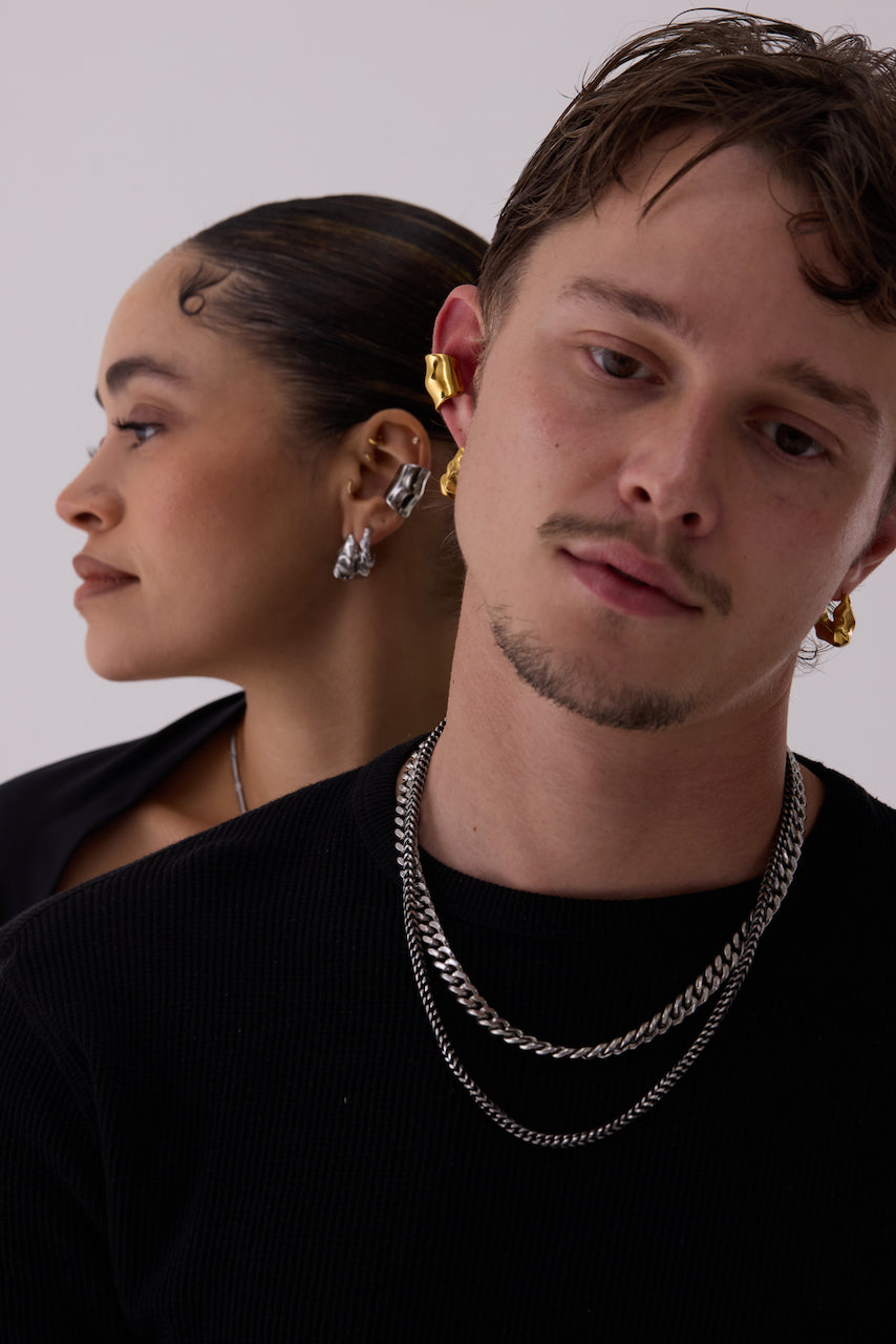 Our pieces are made with titanium steel and coated in PVD gold plating — a long-lasting, tarnish-resistant finish that’s more durable than traditional gold plating. It’s water-resistant, hypoallergenic, and safe for sensitive skin.