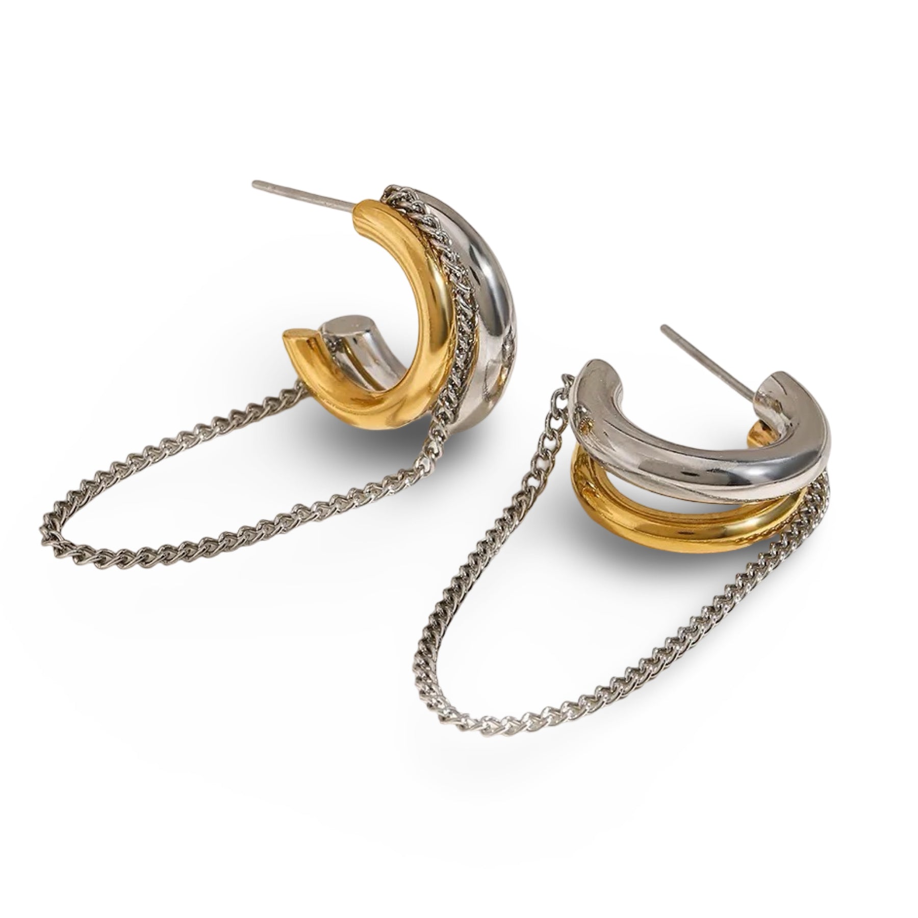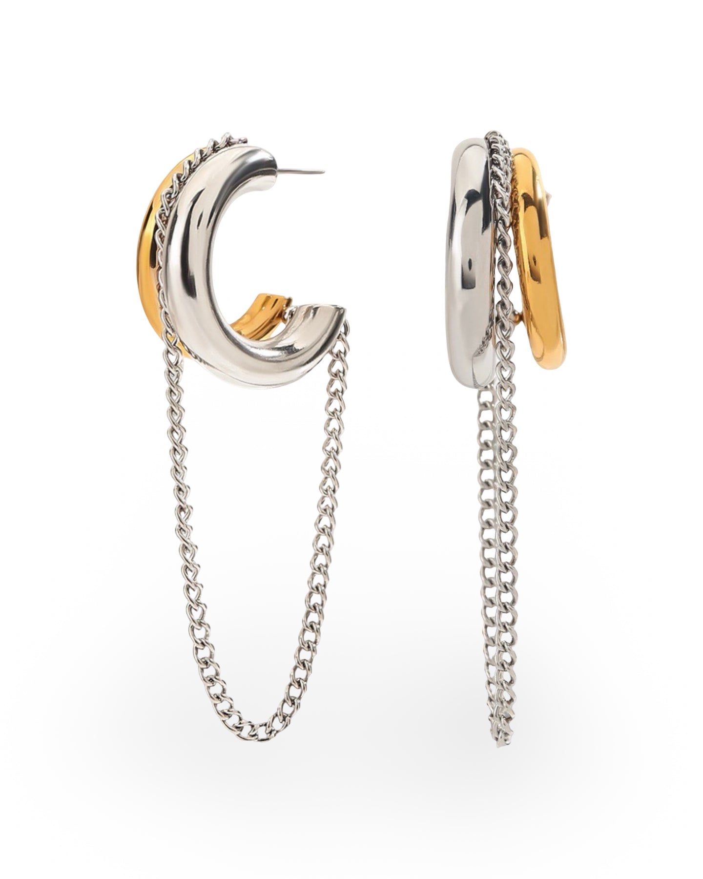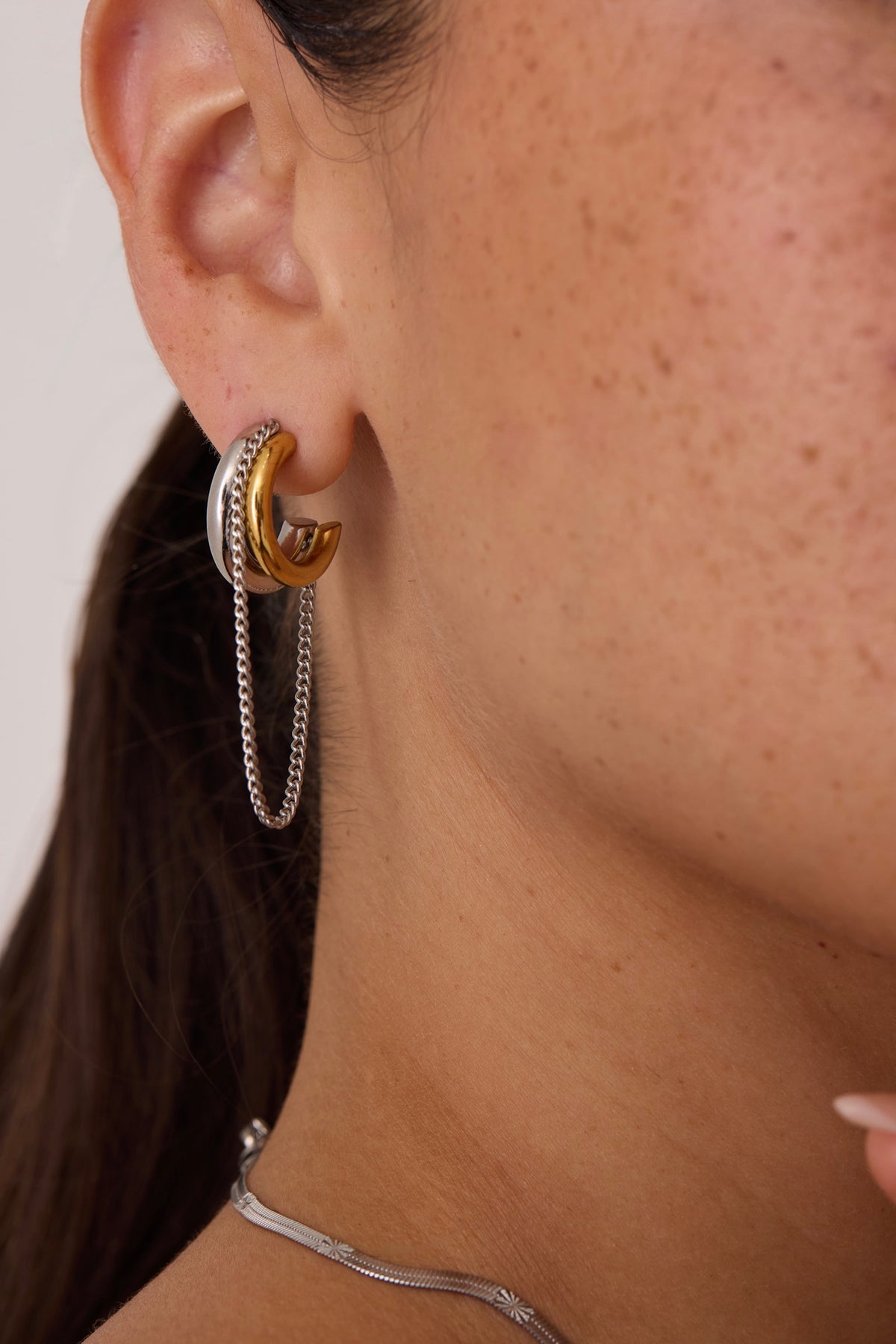 An edgy twist on the everyday hoop — these mini mixed metal earrings feature a sleek gold hoop paired with a silver chain for subtle edge and movement. Lightweight and effortless, they add just the right amount of contrast.