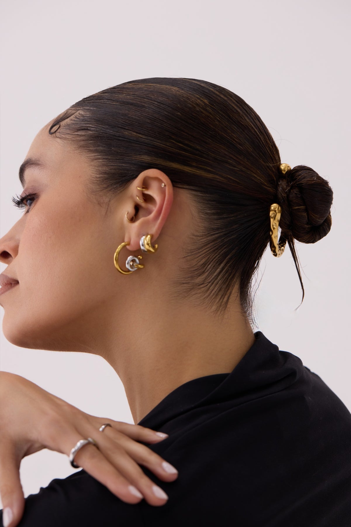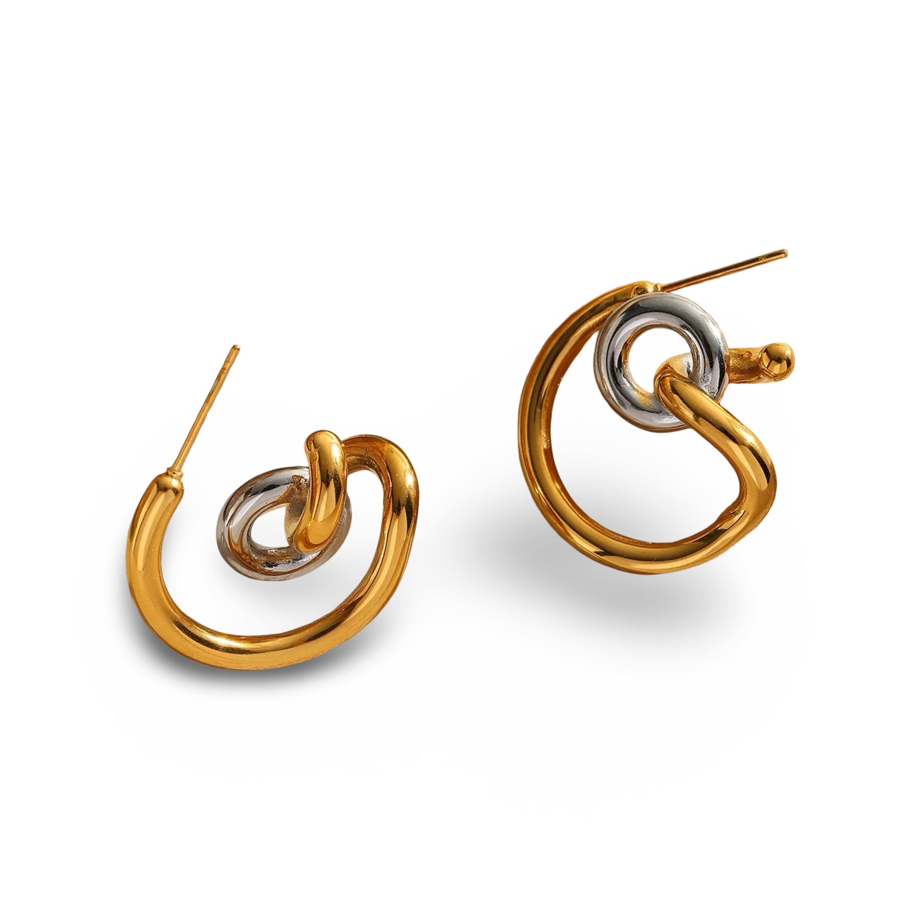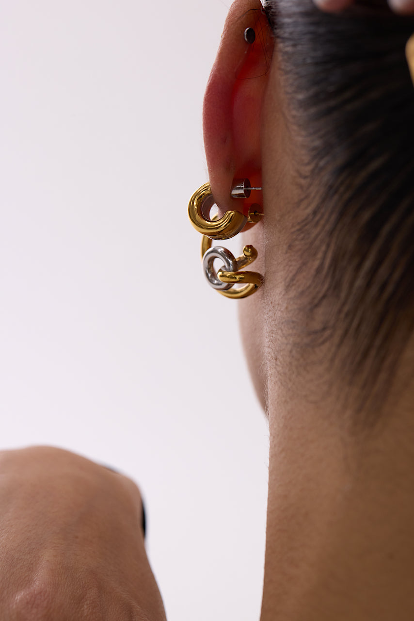These earrings feature an intertwined gold and silver form, shaped into a soft, open curve that moves naturally with the ear. The interlocking elements create subtle tension—polished, dimensional, and intentionally asymmetrical in feel while remaining refined in wear.