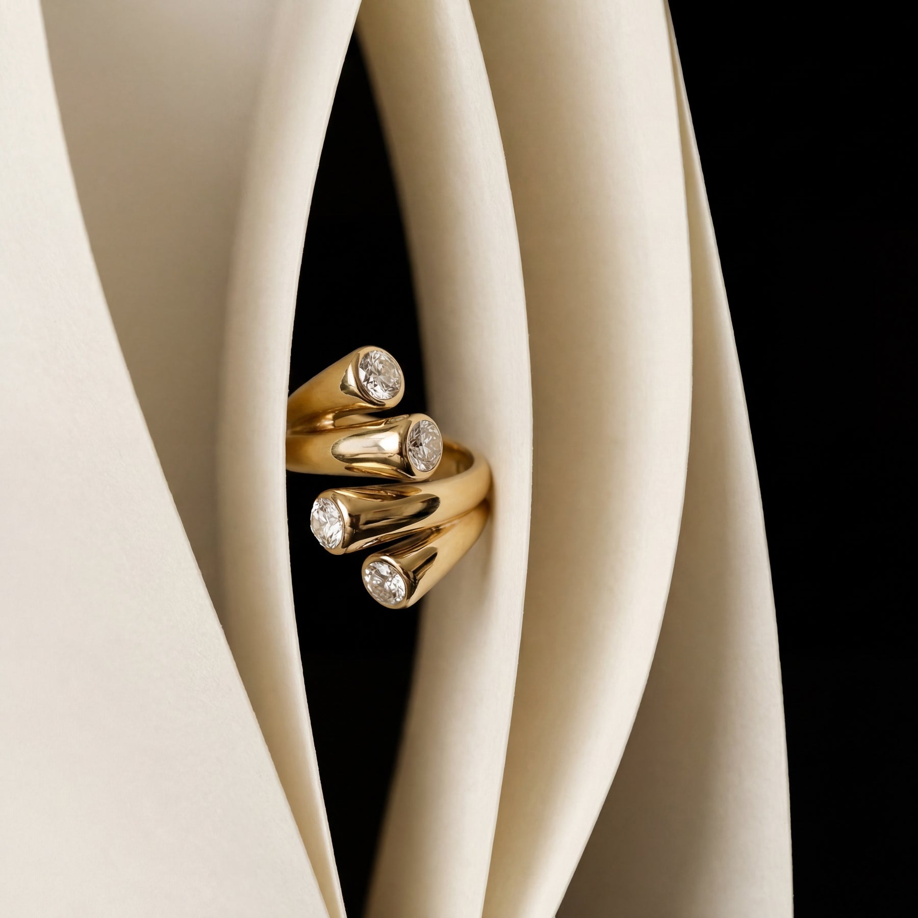 A sculptural mixed-metal ring defined by fluid curves and contrast. Polished silver and gold tones wrap seamlessly around the finger, set with two clear stones for subtle shine. Designed to feel bold - made to stand alone or anchor your everyday stack.