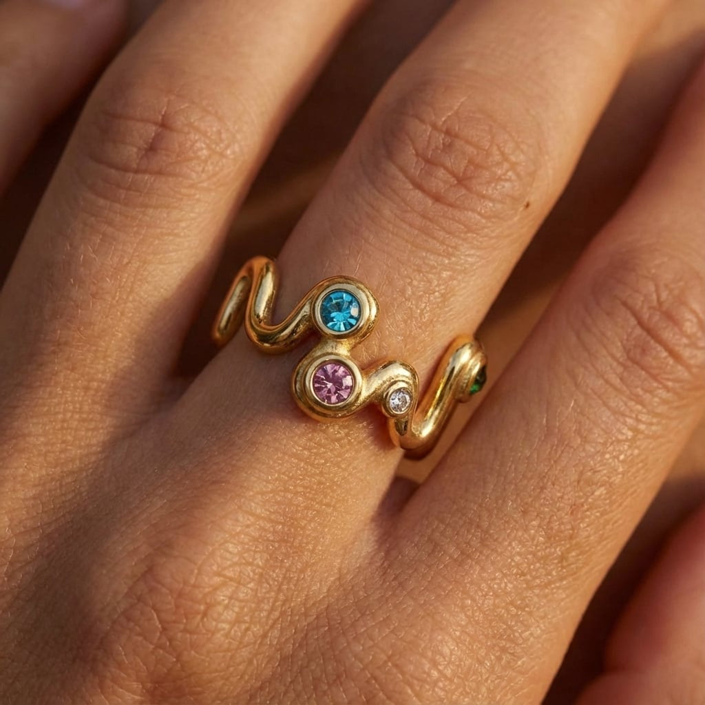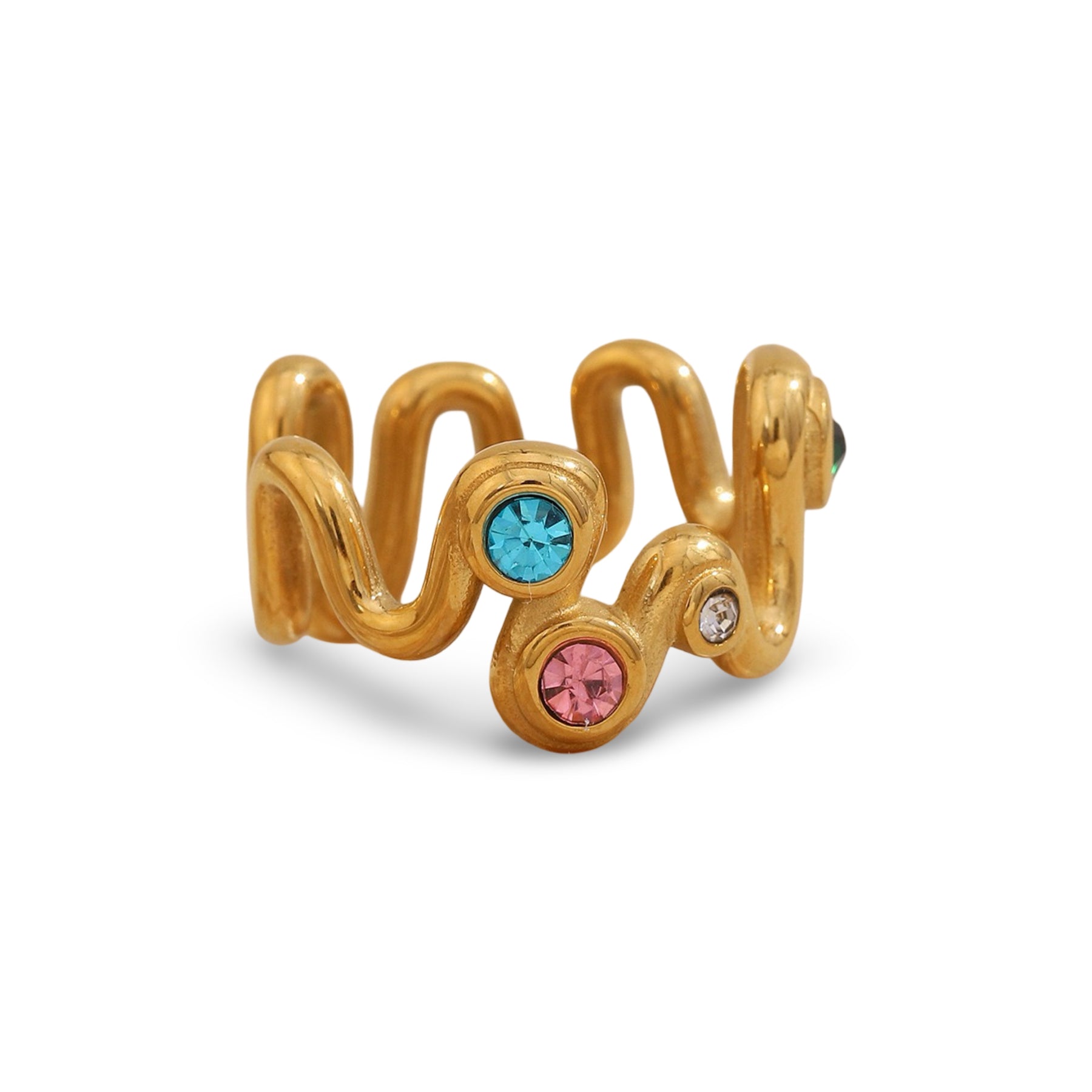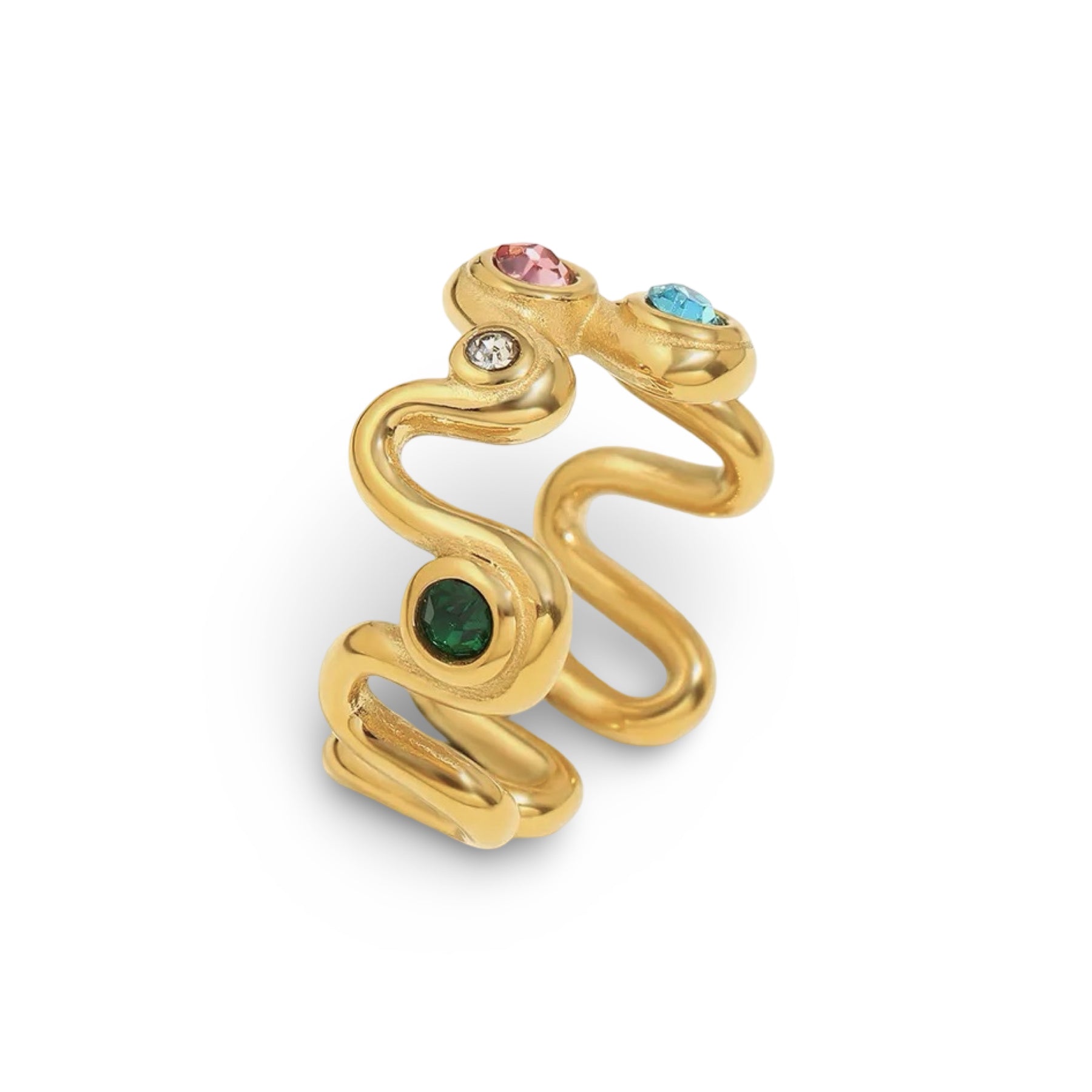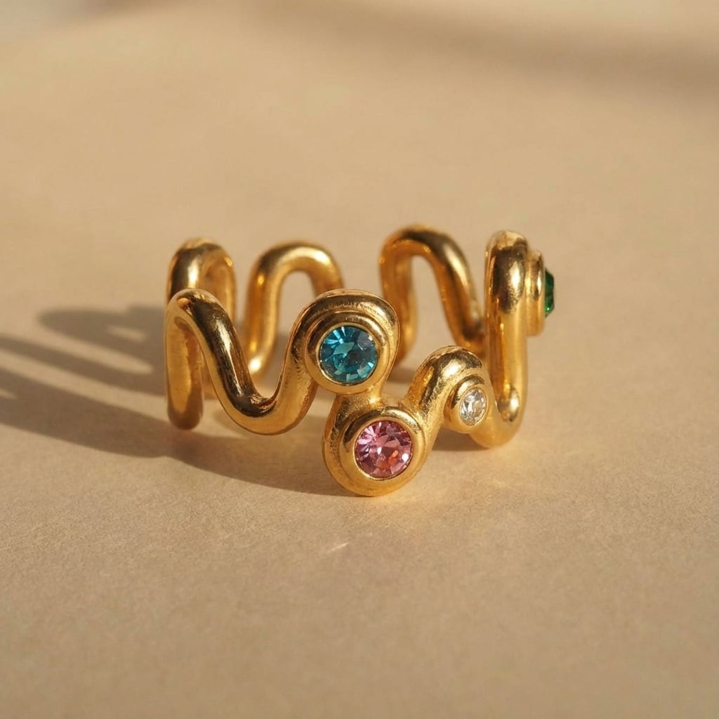 A sculptural ring defined by movement and subtle color. The undulating band wraps the finger in a continuous wave, accented with polished stones set along its curves. Each stone introduces a soft contrast in tone, adding dimension without overwhelming the design.