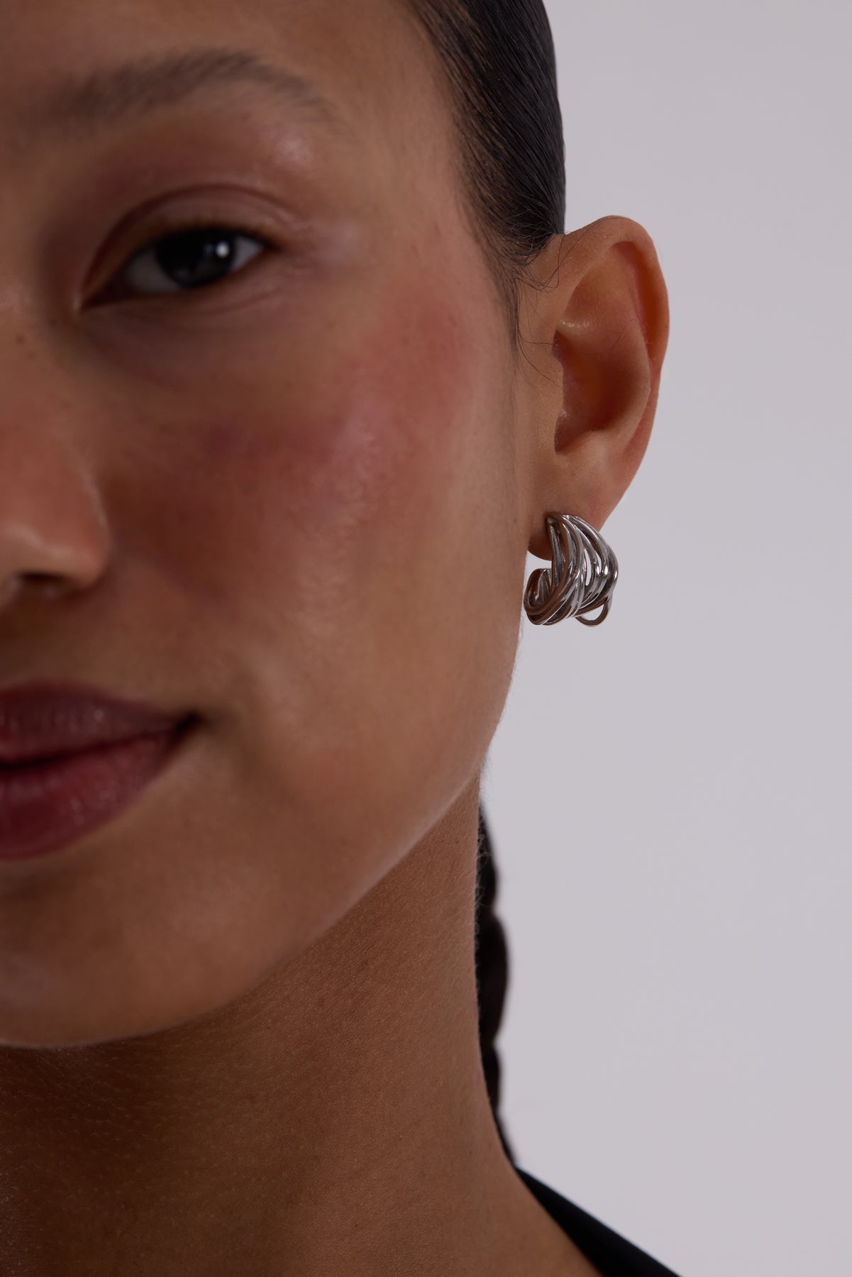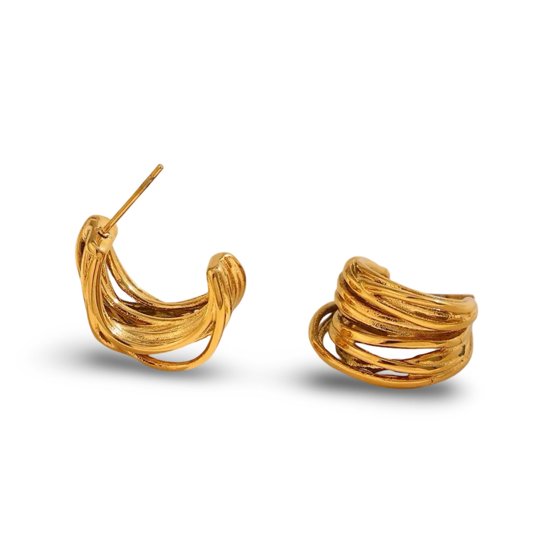A sculptural statement defined by layered movement and organic form. These earrings feature multiple fluid strands that wrap and fold into a compact silhouette, creating depth, texture, and a sense of motion from every angle. Bold yet controlled, the design feels expressive without overwhelming.