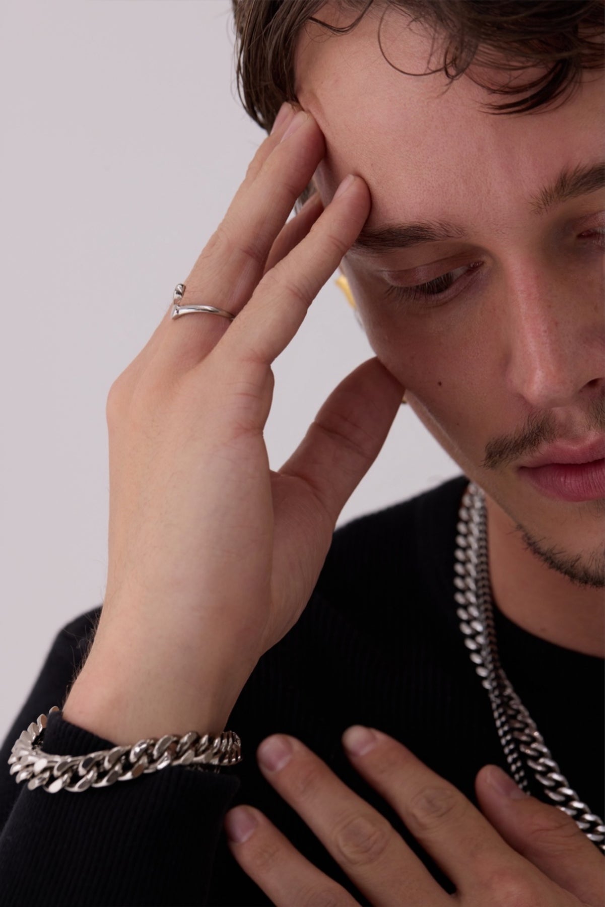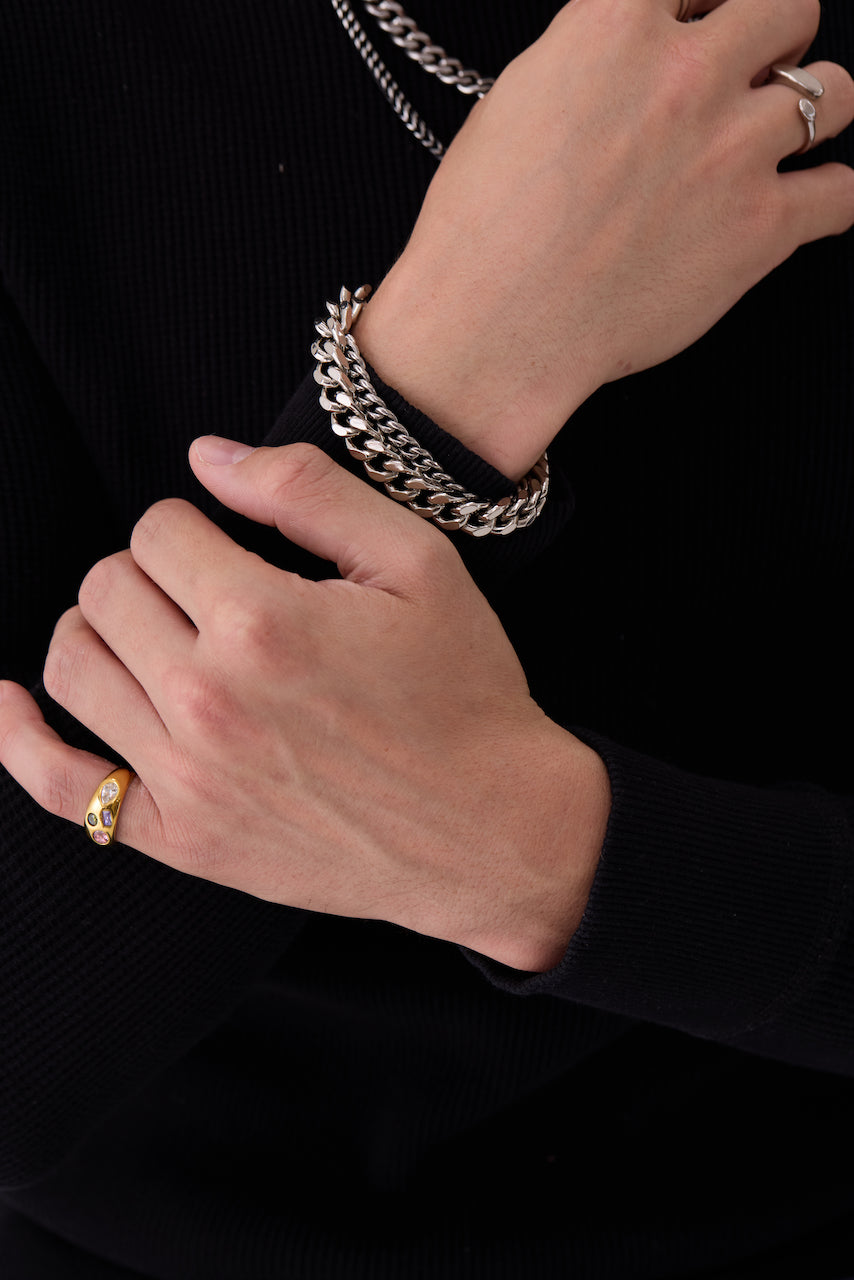 A bold, weighty chain bracelet with tightly interlocked links and a smooth, high-polish finish. Designed to sit comfortably on the wrist, it has a solid feel without looking overworked—clean, grounded, and quietly strong. The silhouette is classic but intentional, making it an easy everyday piece that stands on its own or pairs seamlessly with rings and chains.