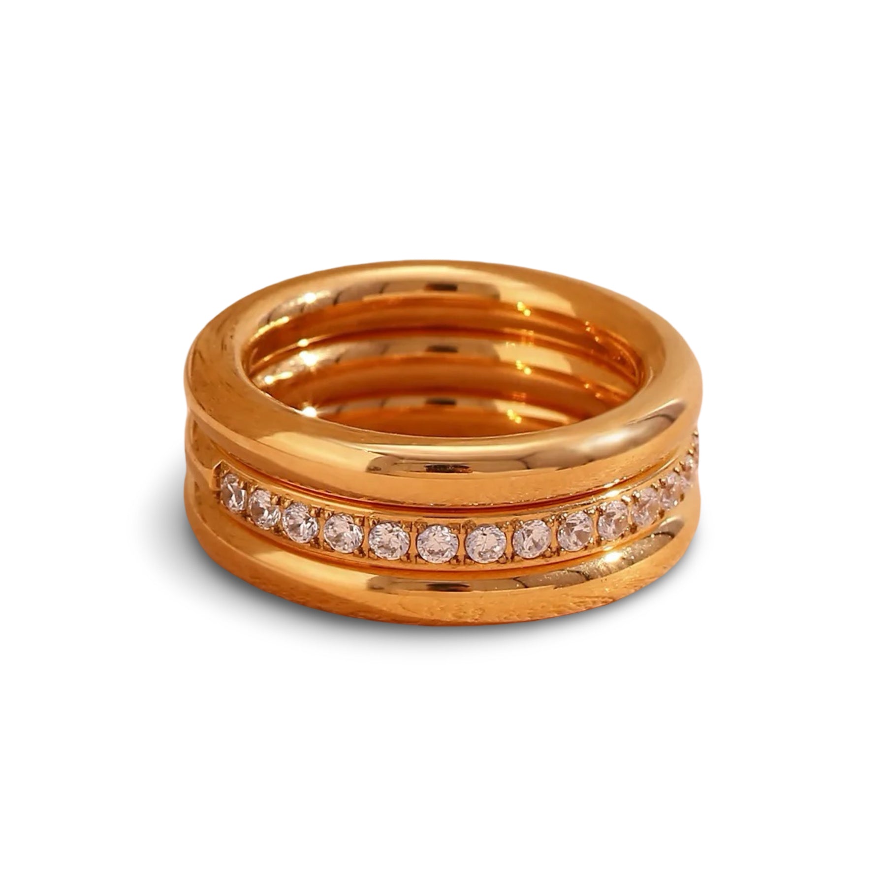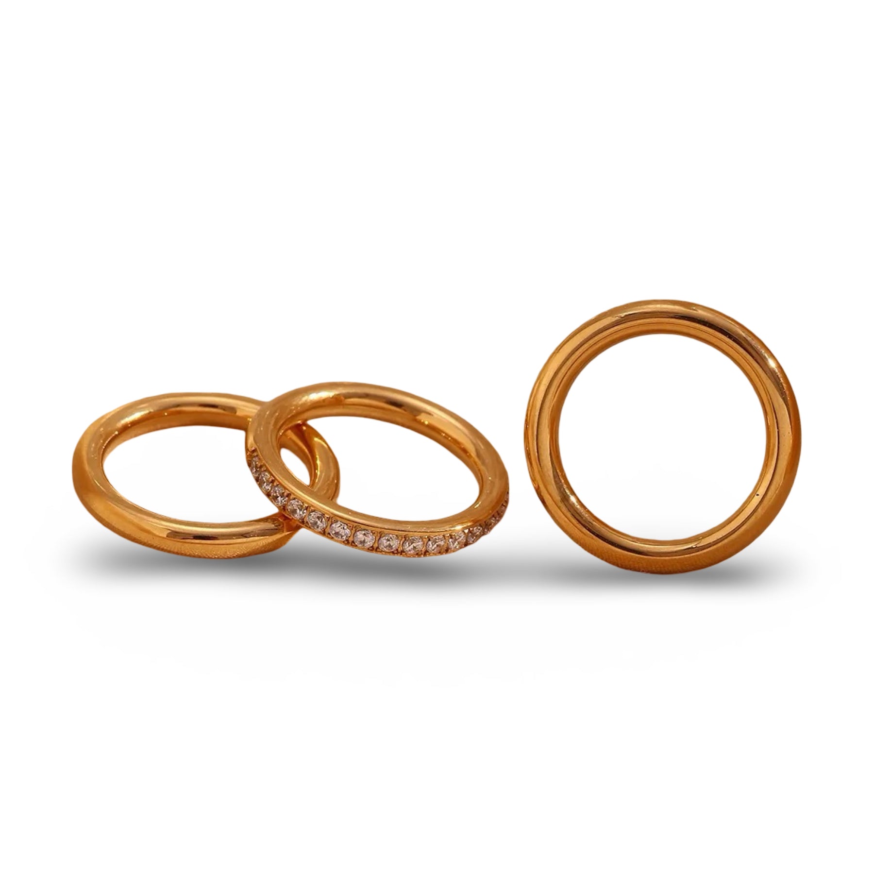 A polished gold band set of 3 with a continuous line of clear stones. Clean and minimal, this ring is designed for stacking or wearing on its own as a refined accent.