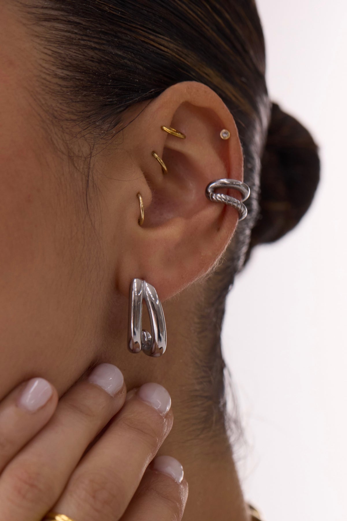 A sculptural ear cuff with a coiled, ribbed silhouette that wraps the ear in a quiet, tactile way. Its textured surface catches light unevenly, giving the piece depth and character without feeling heavy. Designed to sit comfortably with a gentle open curve, it adds edge and dimension—no piercing required.