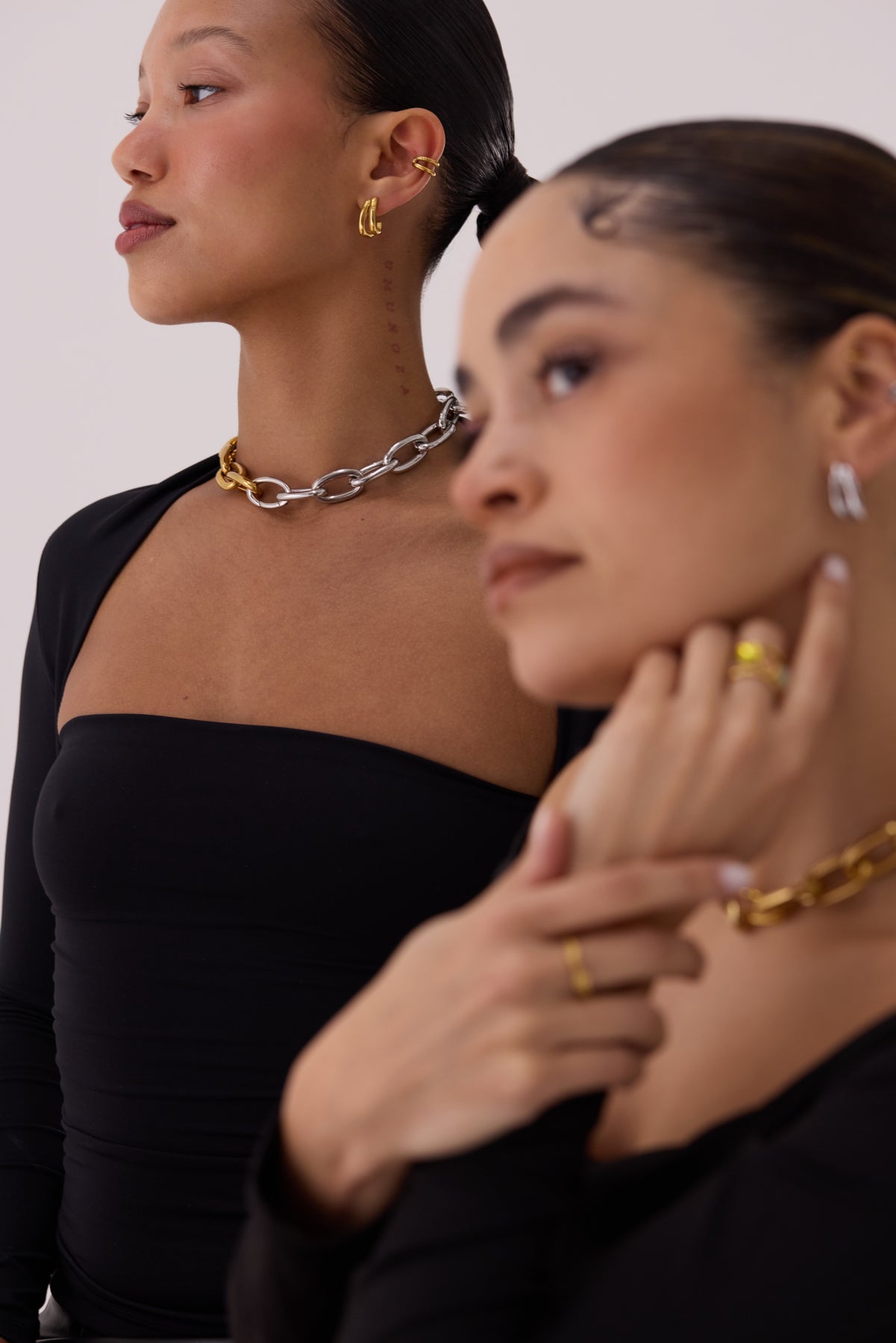 Our pieces are made with titanium steel and coated in PVD gold plating — a long-lasting, tarnish-resistant finish that’s more durable than traditional gold plating. It’s water-resistant, hypoallergenic, and safe for sensitive skin.