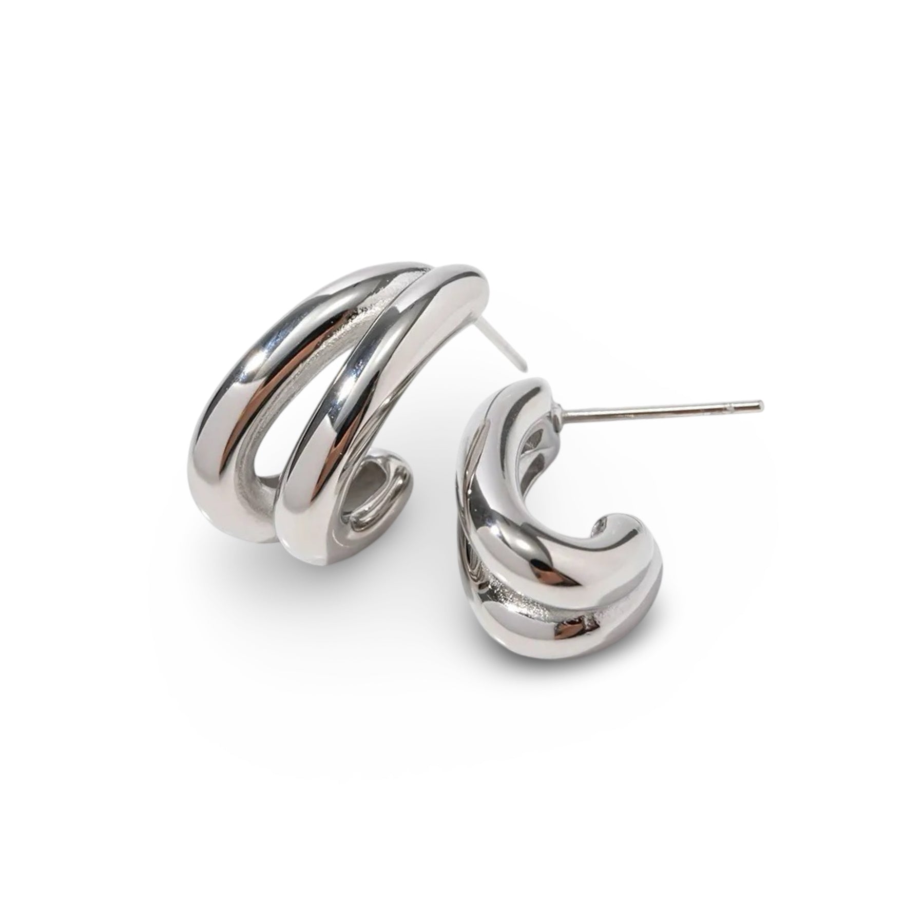 These sculptural earrings feature a layered, curved silhouette with a smooth, high-polish finish that catches light from every angle. The double-arched shape creates depth and dimension while maintaining a clean, intentional profile on the ear.