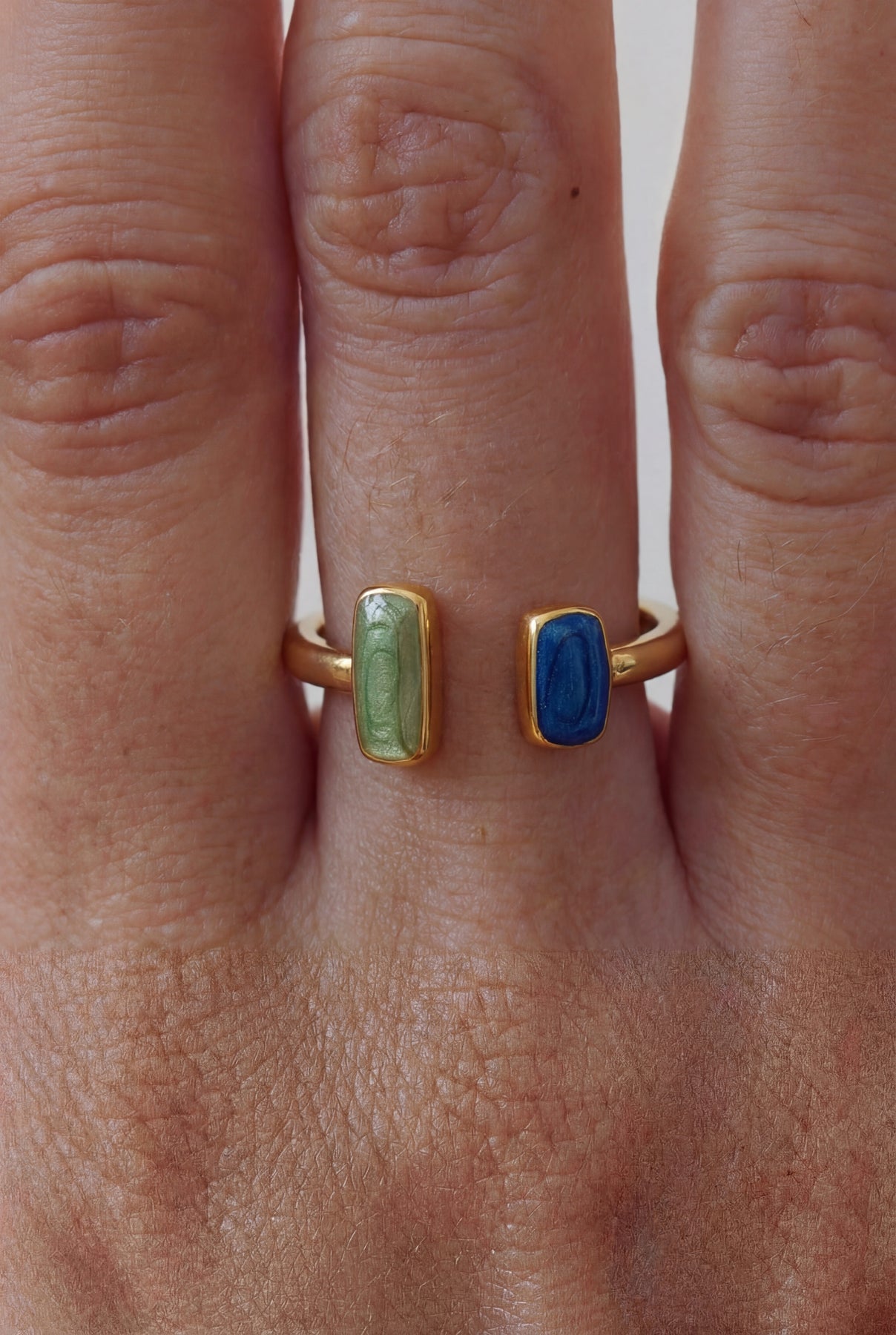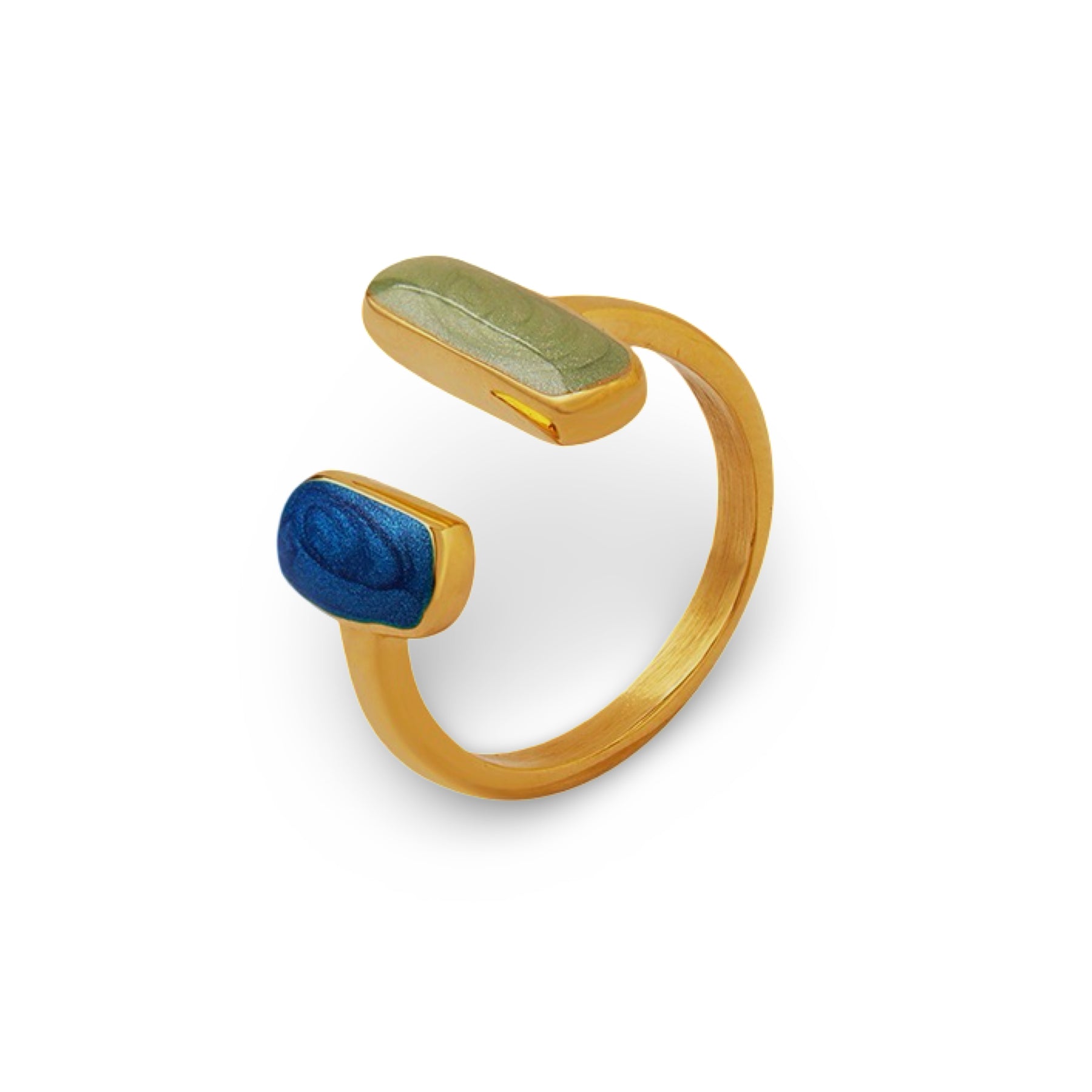 An adjustable gold ring finished with two softly rounded ends in contrasting tones. Minimal yet expressive, this piece adds subtle color and works beautifully worn alone or layered.