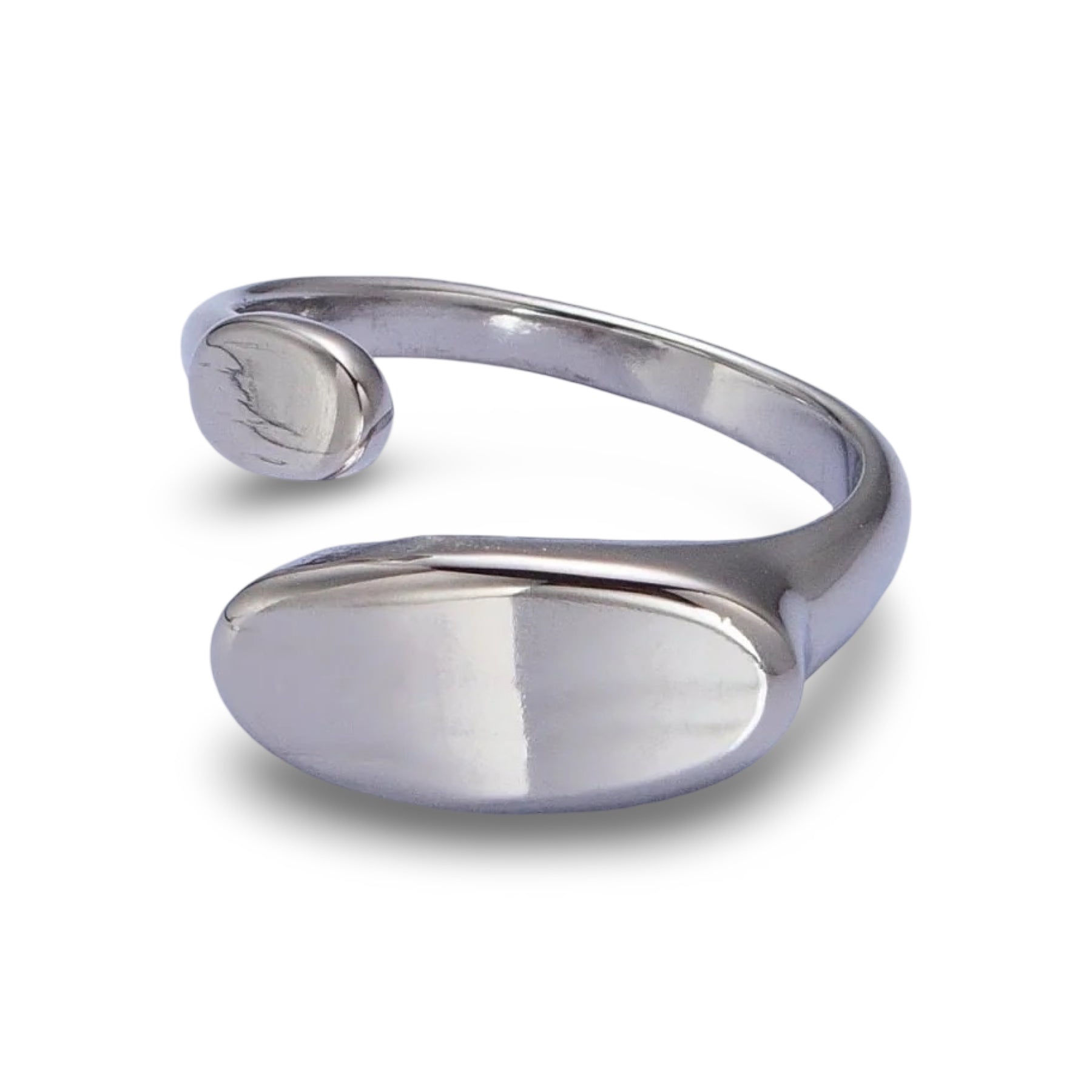 A sculptural open-front ring defined by smooth, rounded ends and a fluid silhouette. The softened oval forms create a sense of balance and movement, giving the piece a bold presence while remaining clean and wearable.