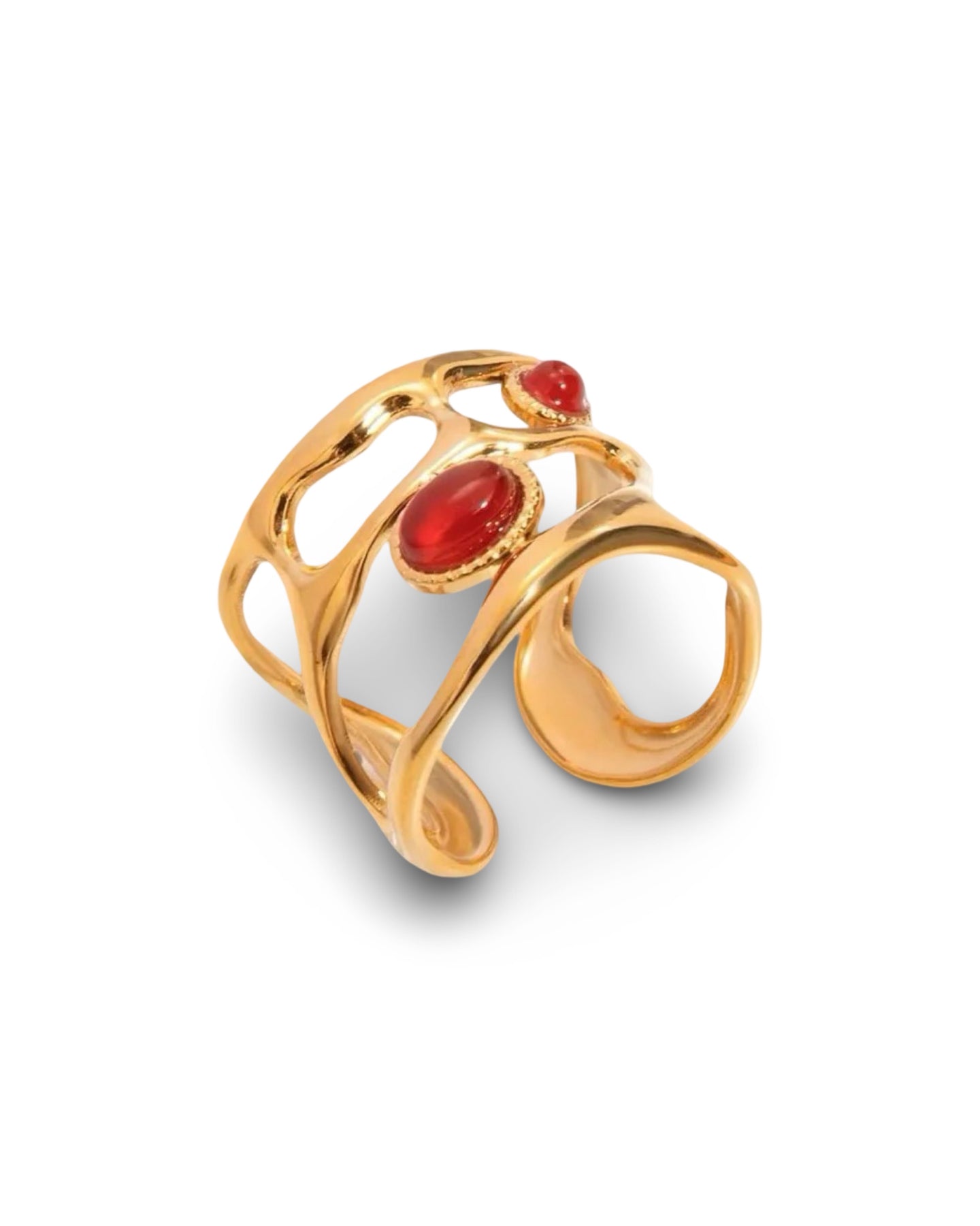 The Joliette ring features an intricate textured band that adds depth and character, while the striking red stones create a beautiful contrast, catching the light with every movement. Each stone is thoughtfully set to enhance its brilliance, making this ring a true statement accessory. Perfect for adding a pop of color to any outfit, it’s ideal for both casual and formal occasions.