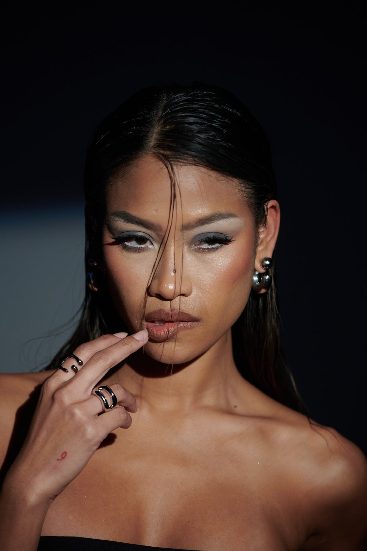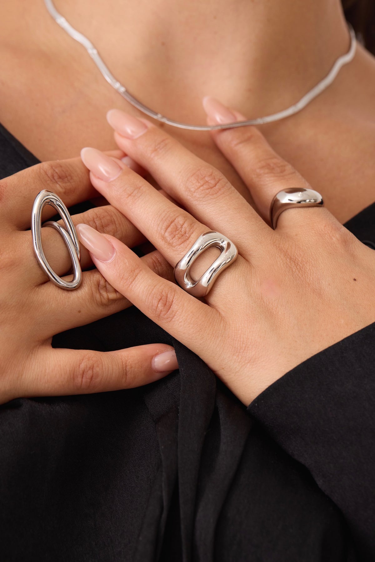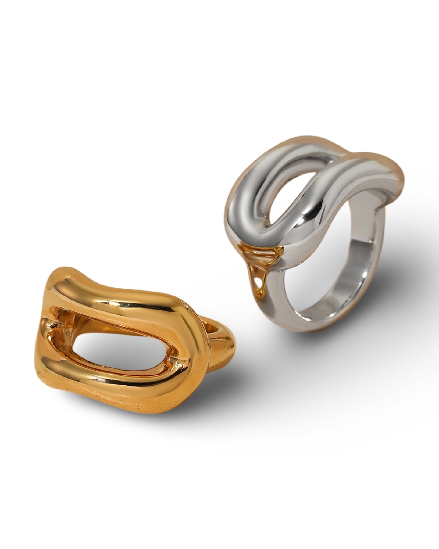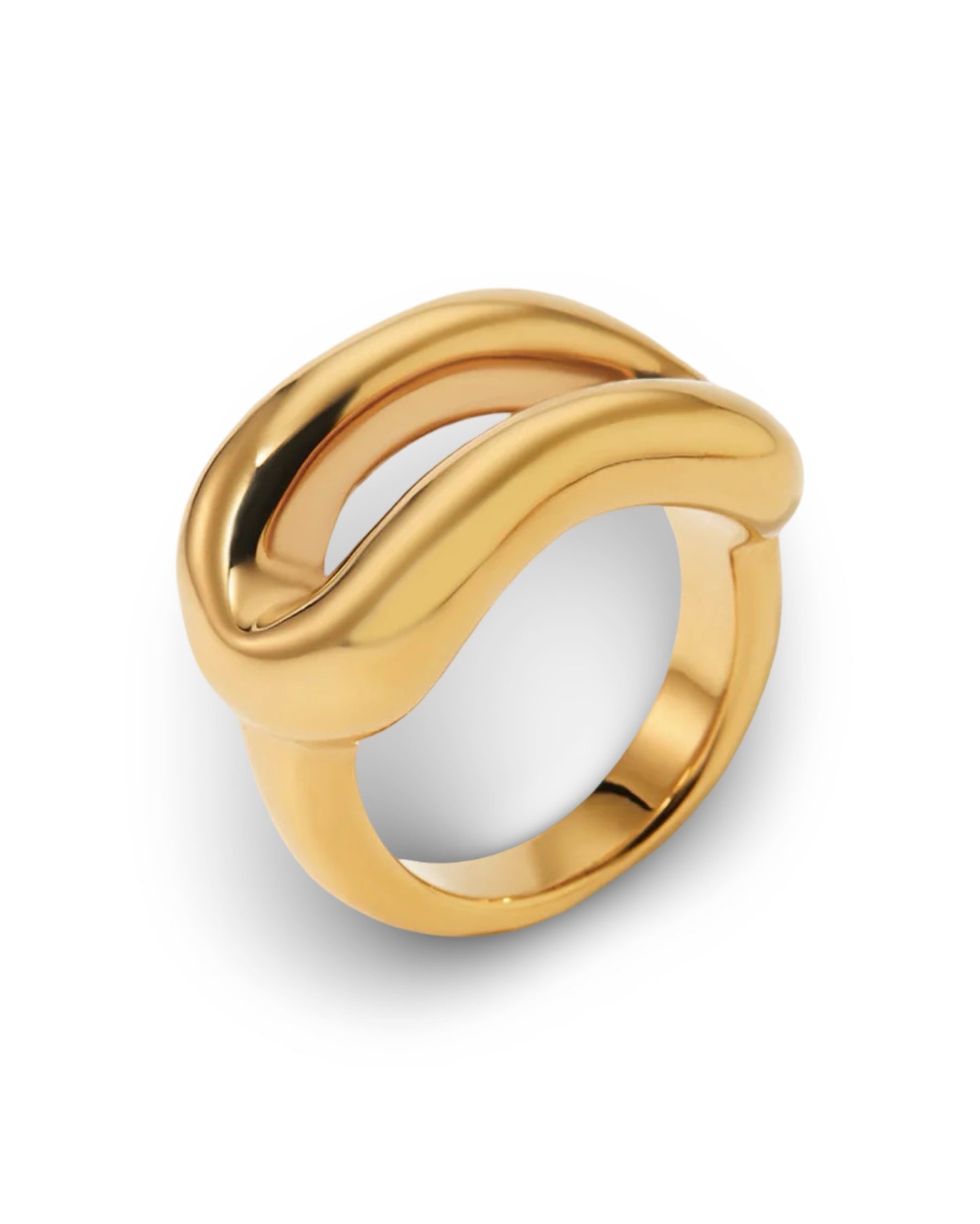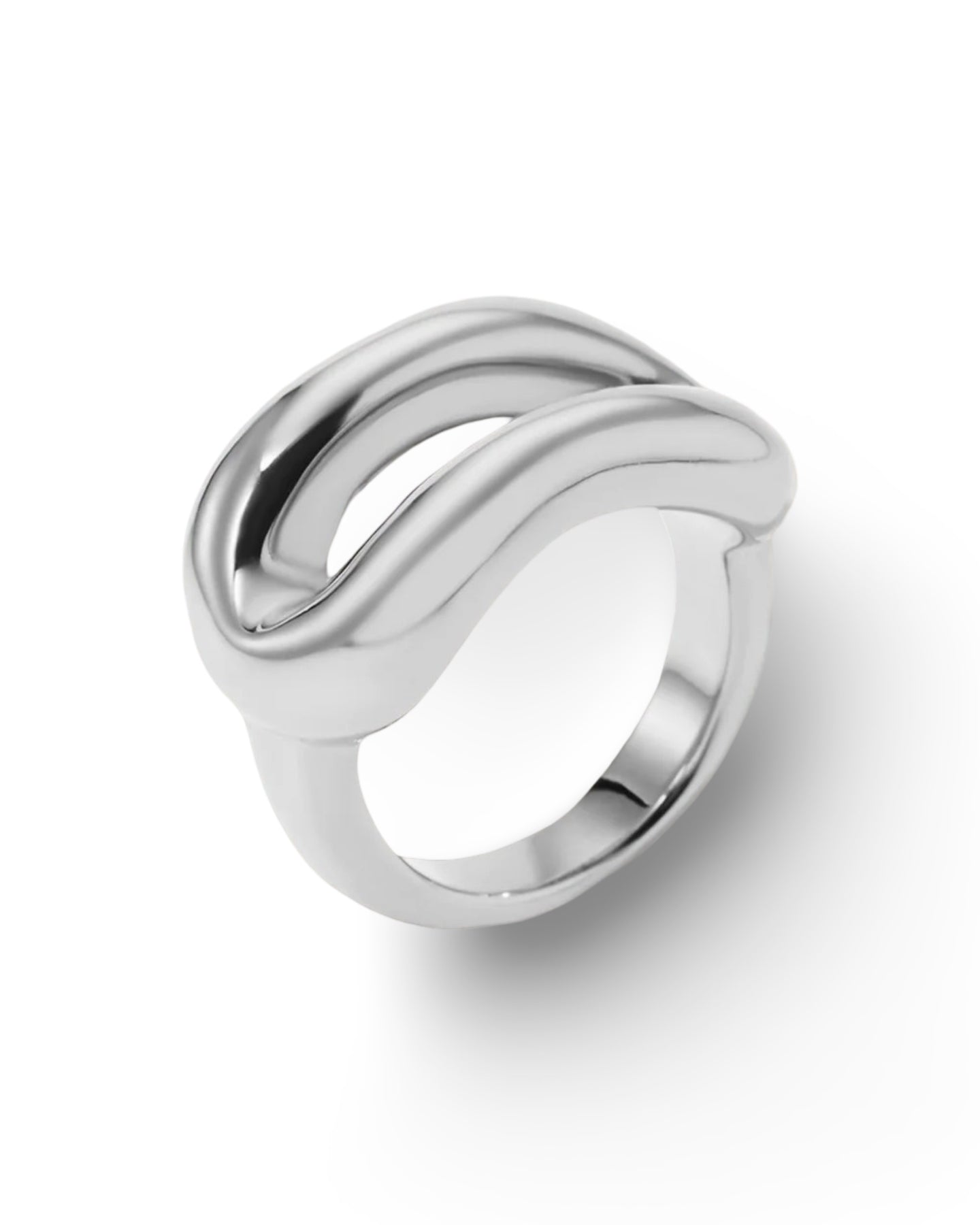 The Julia ring is a sleek, sculptural statement piece crafted from high-quality stainless steel. Its bold, fluid form features two smooth, curved bands that rise and dip in a wave-like silhouette, creating a striking negative space at the center.