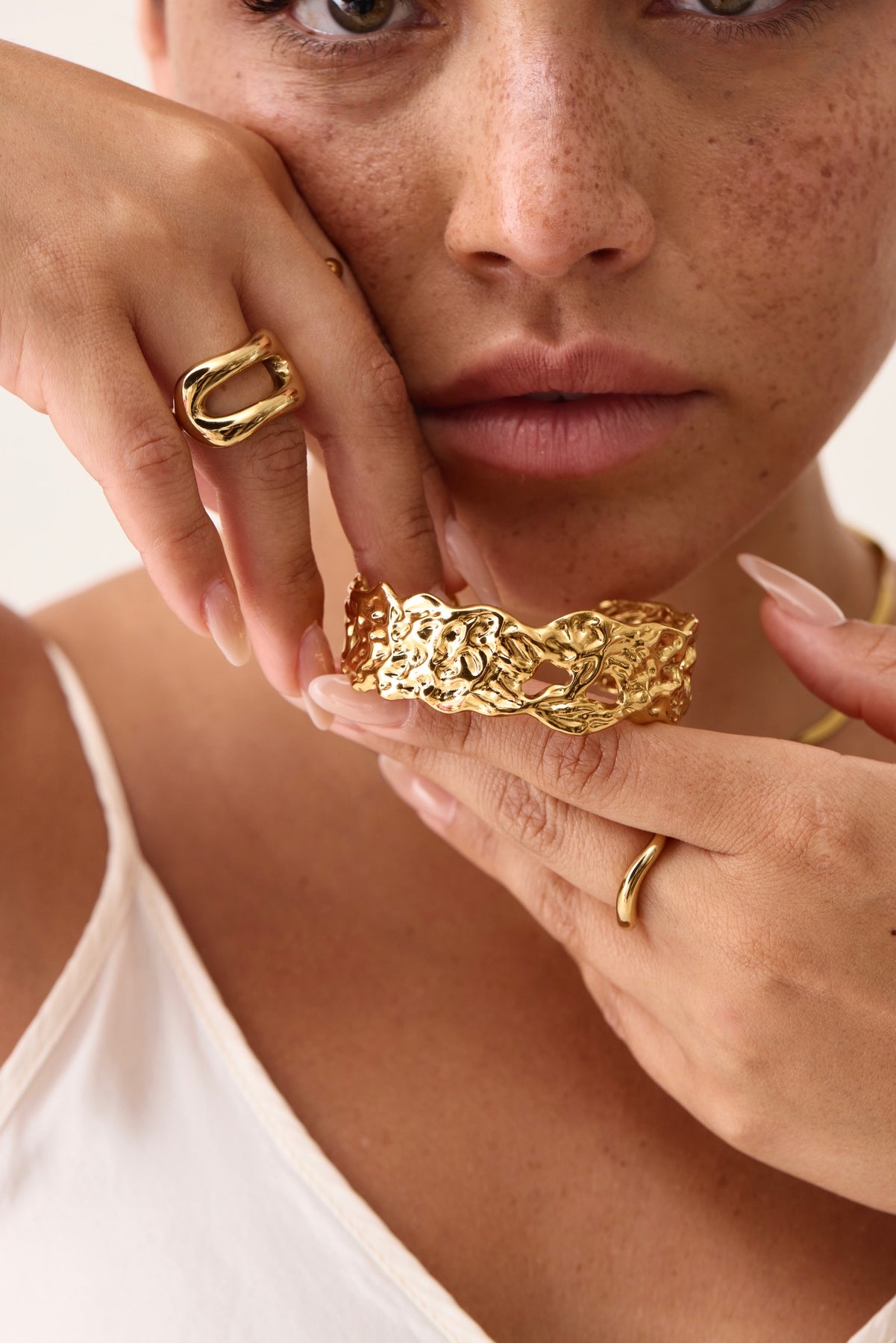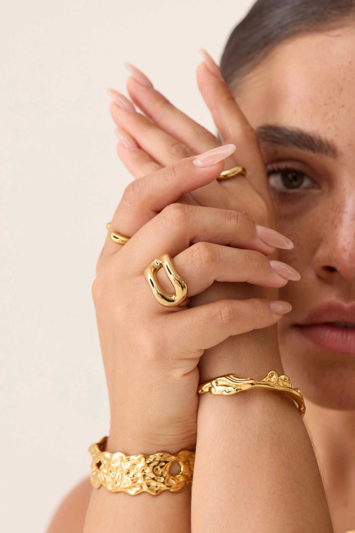 Our pieces are made with titanium steel and coated in PVD gold plating — a long-lasting, tarnish-resistant finish that’s more durable than traditional gold plating. It’s water-resistant, hypoallergenic, and safe for sensitive skin.
